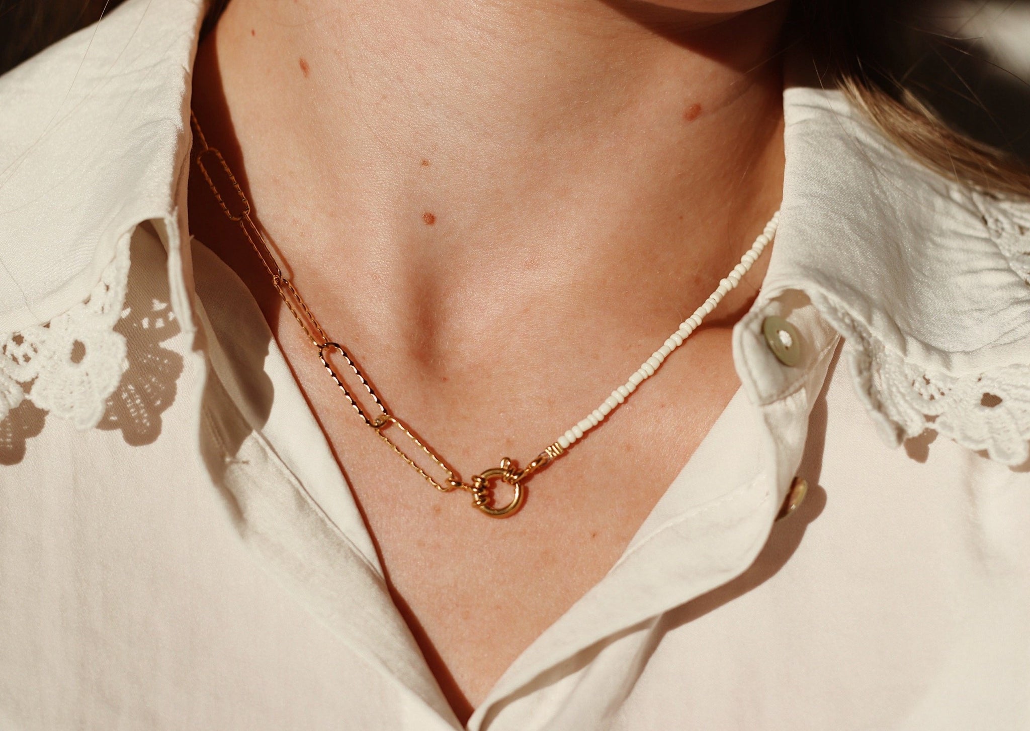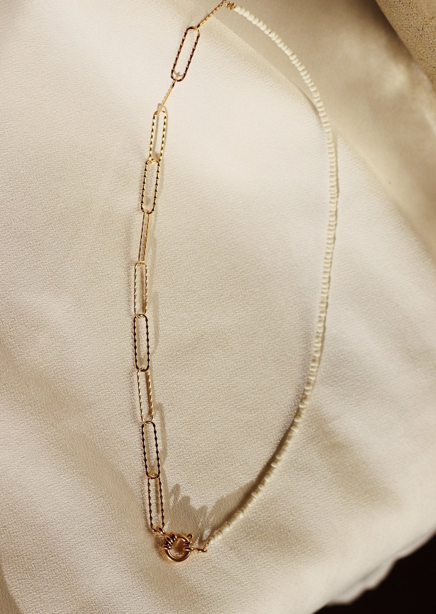Deze ketting lijkt erg op onze chain lock maar is een stukje fijner en heeft een mooi bewerkt randje! De kraaltjes zijn ook fijner en de kleur daarvan is creme wit. De gouden rand is stainless steel!