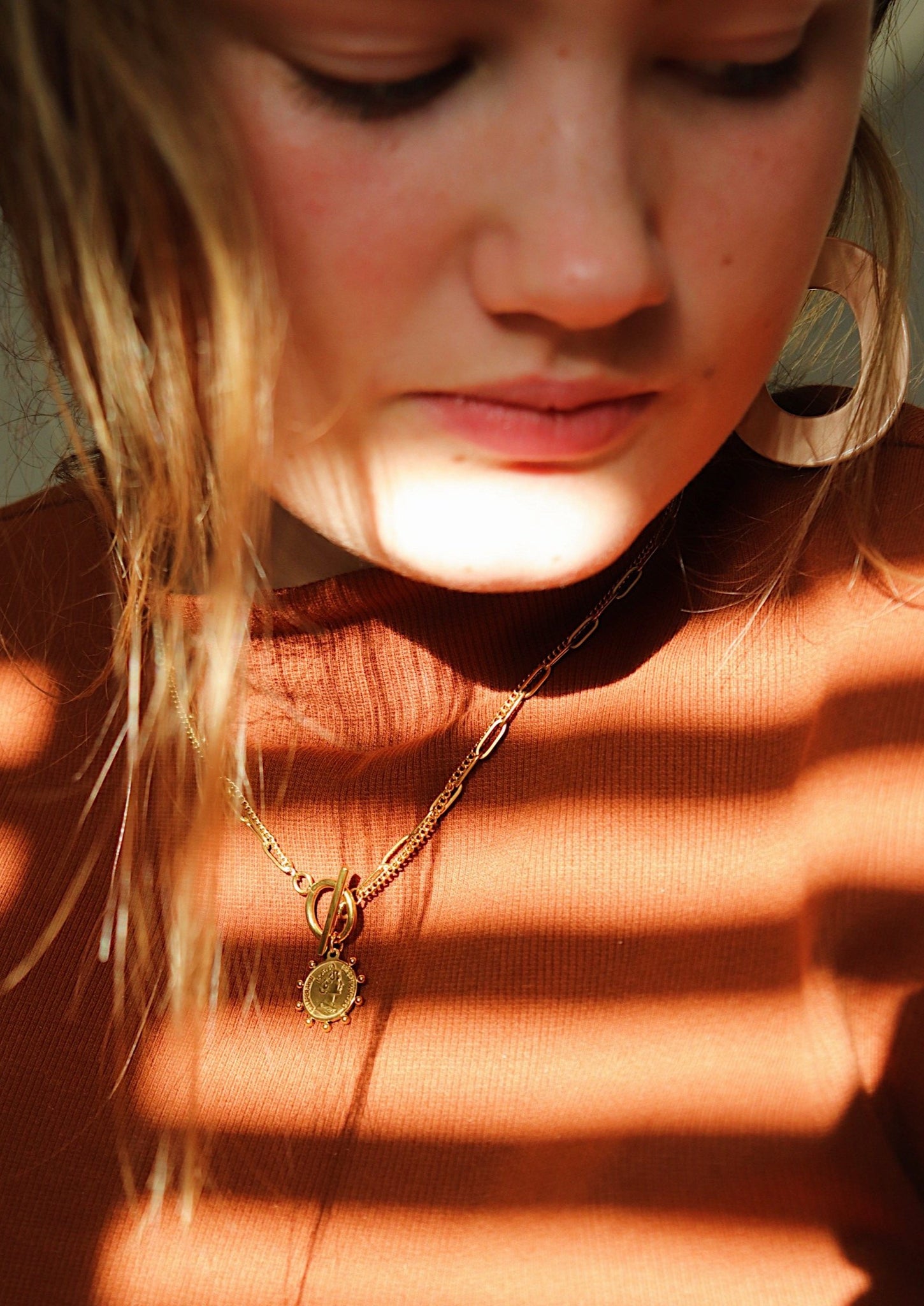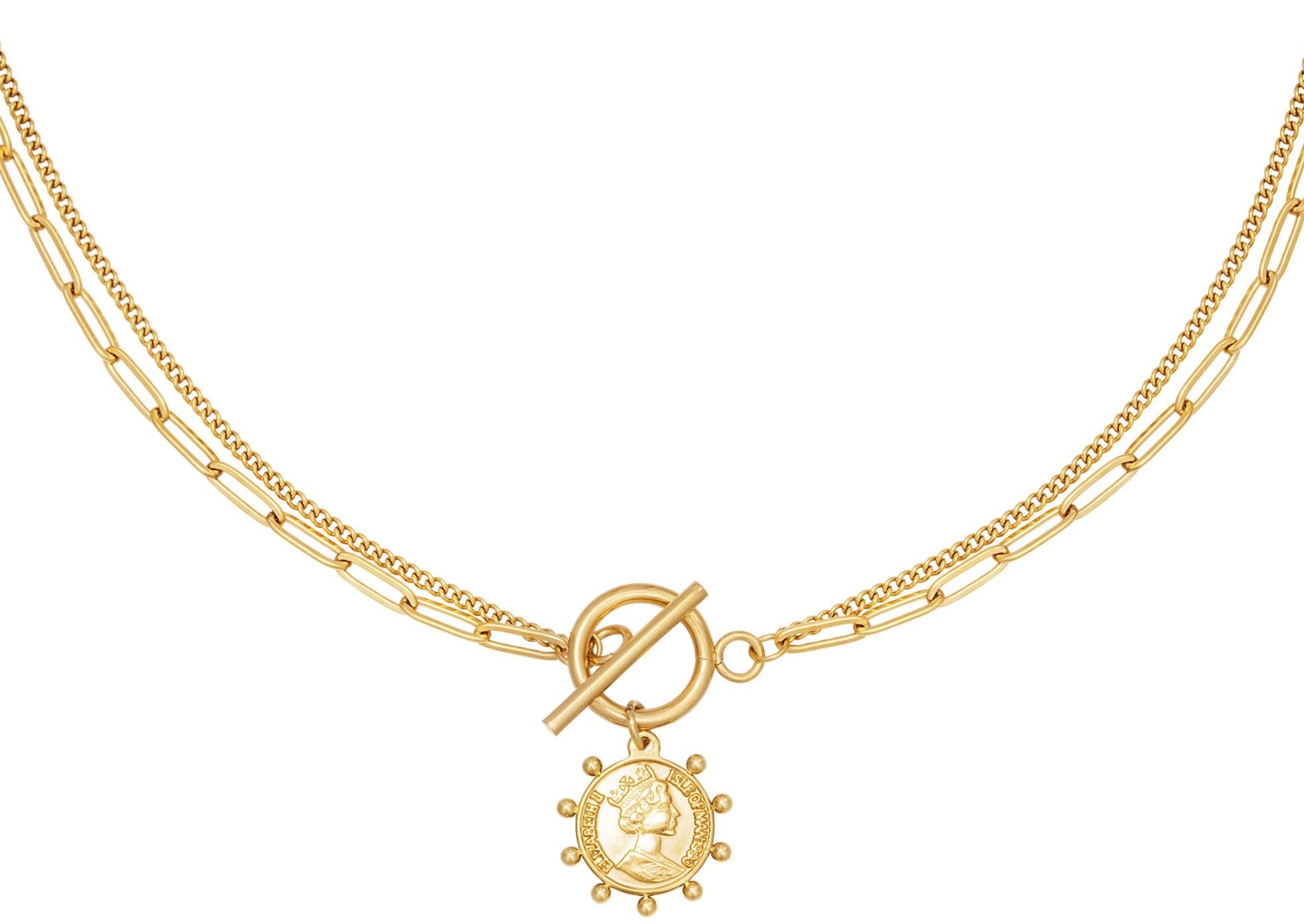 Deze prachtige ketting is gemaakt van stainless steel en heeft een vintage look door de queen coint.