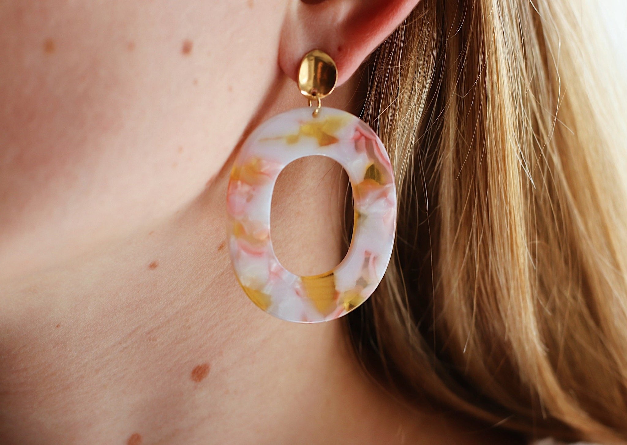 Met deze knapperds ben je helemaal summer ready! De hangers zijn ovaal en gemaakt van resin in mooie zachte pastelkleuren. De oorbellen zijn subtiel en rond en gemaakt van stainless steel.