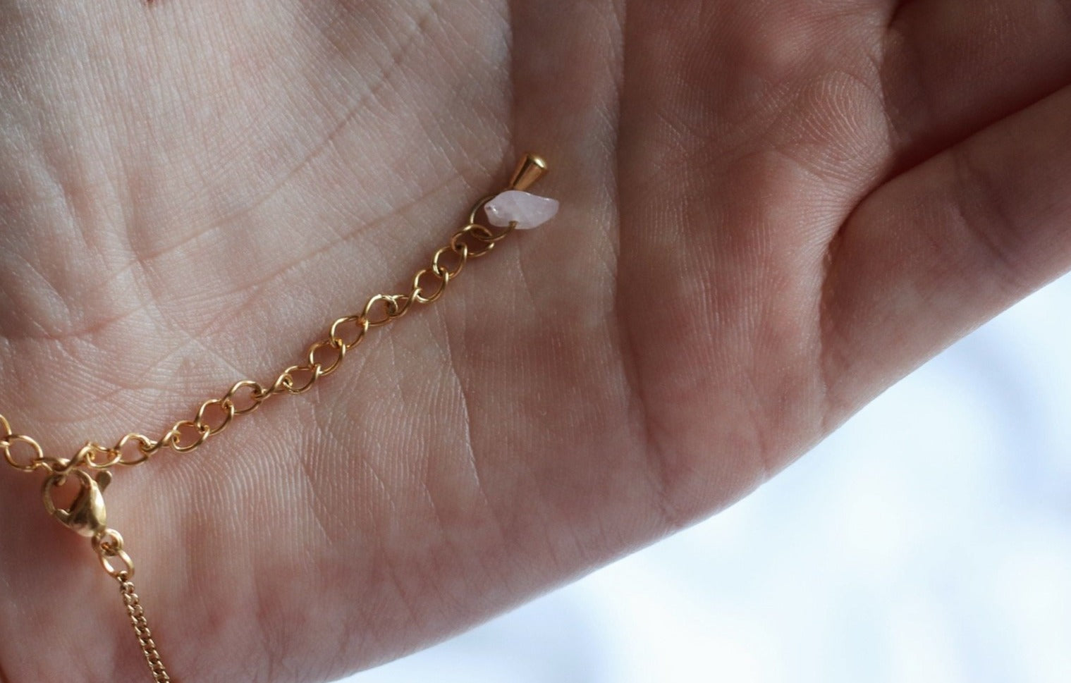 Deze met de hand gemaakte leukerd is gemaakt van chip stone kralen in het licht roze, (natuursteen) dus deze zijn allemaal wisselend van vorm en grootte. Het bandje is goud en gemaakt van Stainless steel.