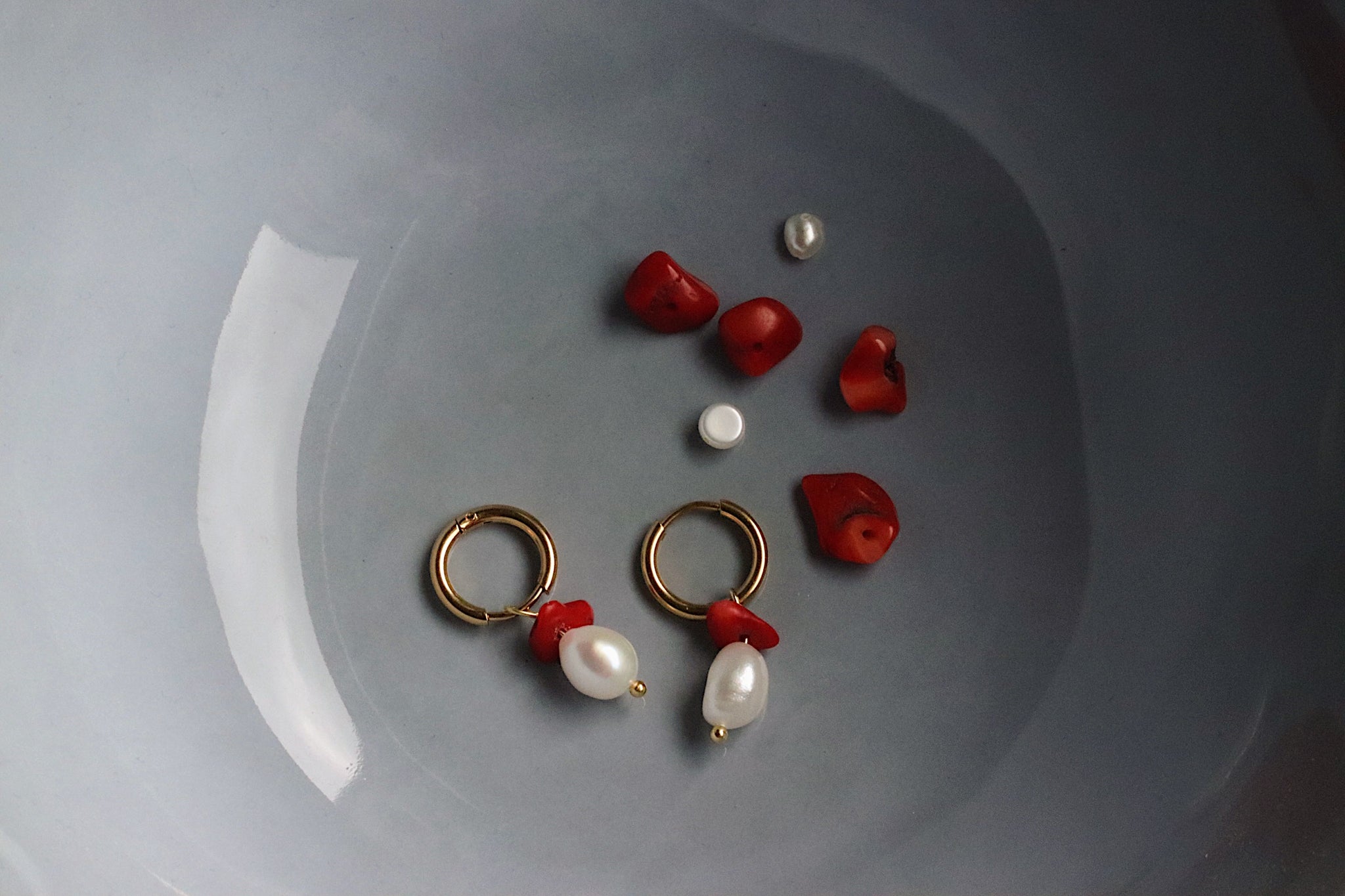 Deze zomerse oorbelletjes zijn gemaakt van Stainless steel. De hanger is een combinatie van een zoetwaterpareltje en een rode chip stone van natuursteen.